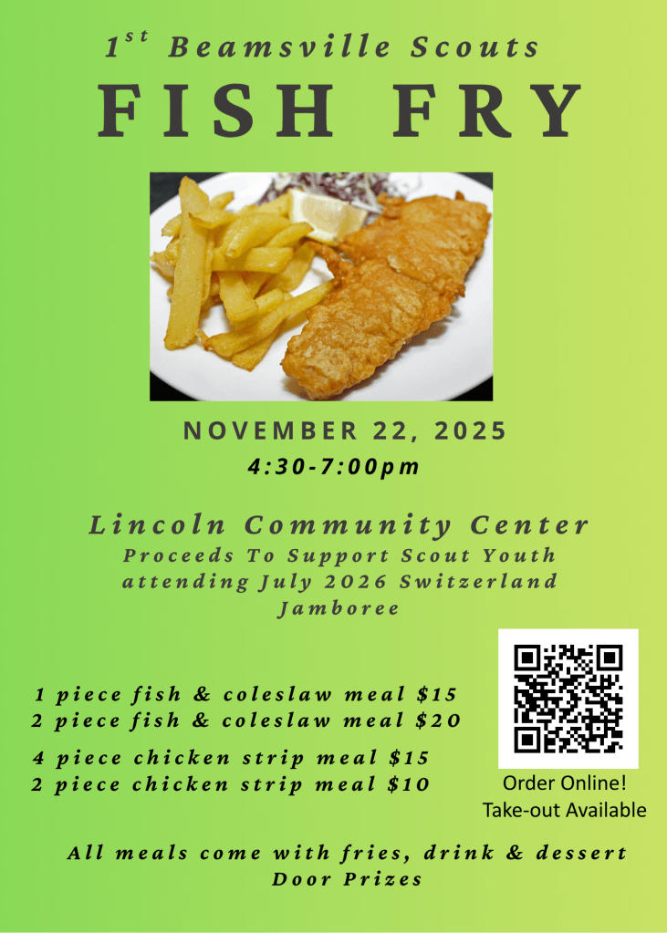 Come out and help support our Beamsville Scouts and their fantastic fish fry on November 22, 2025 at the Lincoln Community Centre!